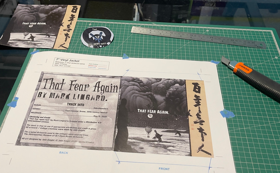 A printed, cropped and glued together mockup of the record sleeve and disc.